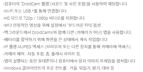 유료 버전으로 DroidCamX (6,200원)으로 구매하면 아래와 같은 기능을 추가로 사용할 수 있다고 하는데