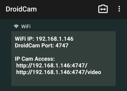 DroidCam 이 실행되면 연결에 필요한 WiFi IP와 Port, 그리고 웹브라우저(크롬)에서 접속 할 수 있는 주소도 표시된다.
