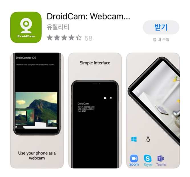 IOS 는 Apple Store에서 DroidCam 을 검색한 후 받기하면 된다