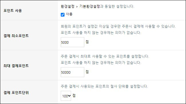 즉, 포인트 사용 범위는 설정할 수 있지만 포인트 결제 가능한 주문금액을 설정할 수는 없어요.