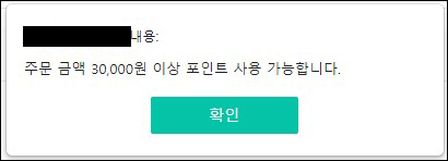 주문서 작성 페이지에서 3만원 이하의 상품 주문시 포인트를 사용하려고 하면 아래처럼 안내창이 뜨게 됩니다.