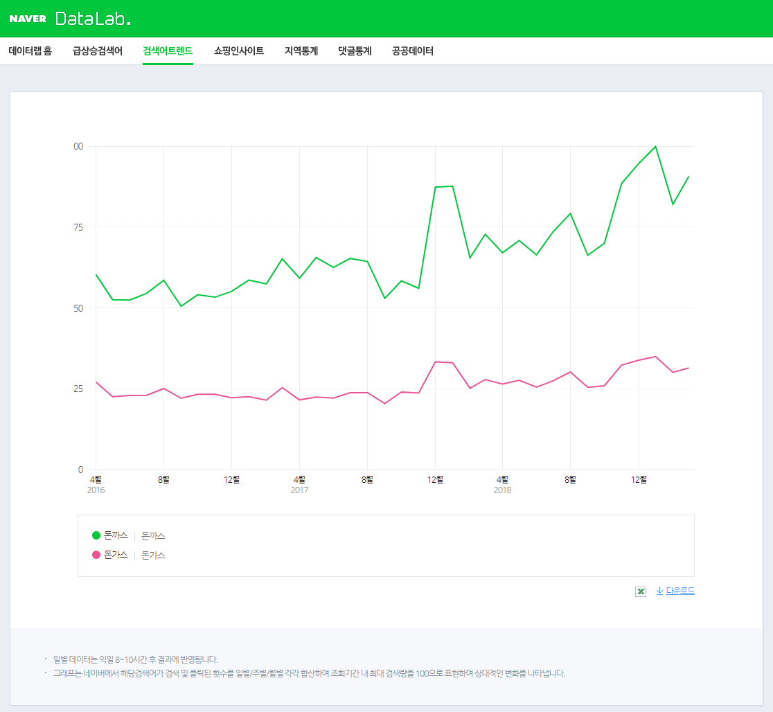 핑크색 그래프의 돈가스보다 초록색 그래프로 나타난 돈까스를 더 많이 검색하는 것으로 나타났다.