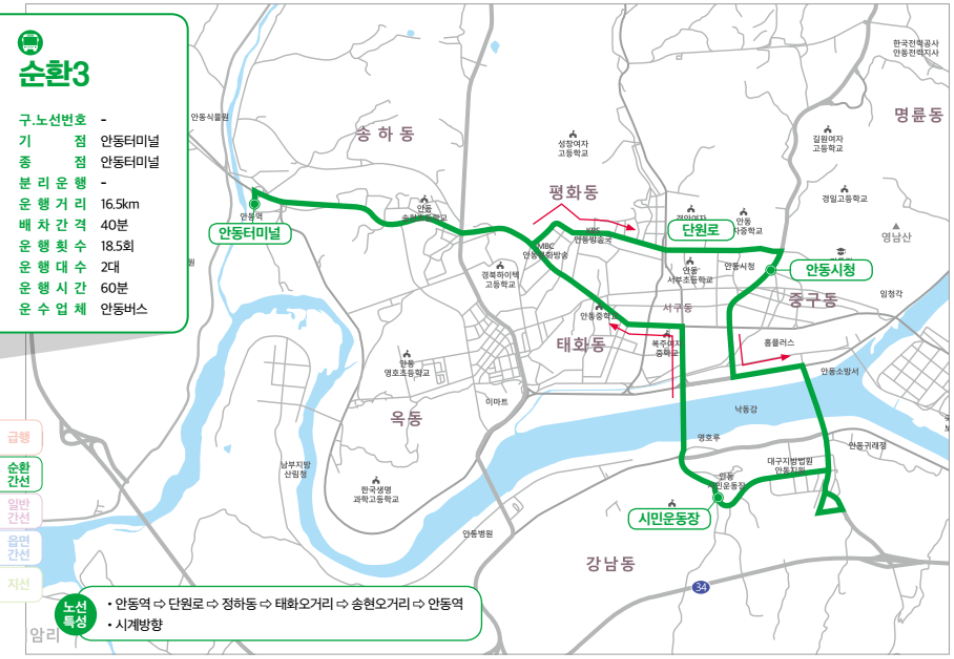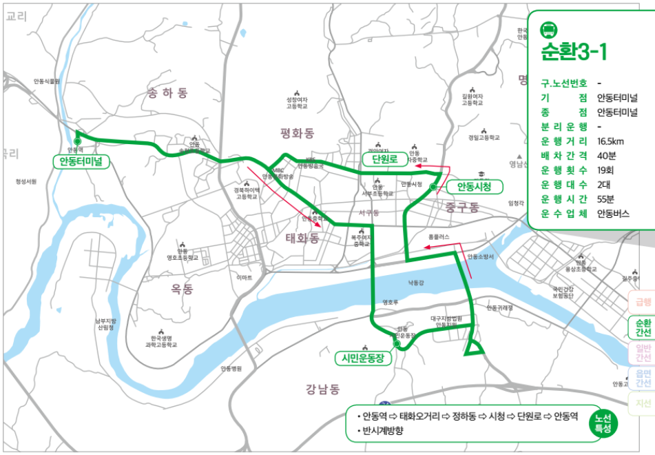순환3, 순환3-1번 노선은 그간 버스 운행에서 소외되었던 단원로 일명 낙타고개 구간과 안동시내, 강남 정하동을 연계하여 운행합니다.