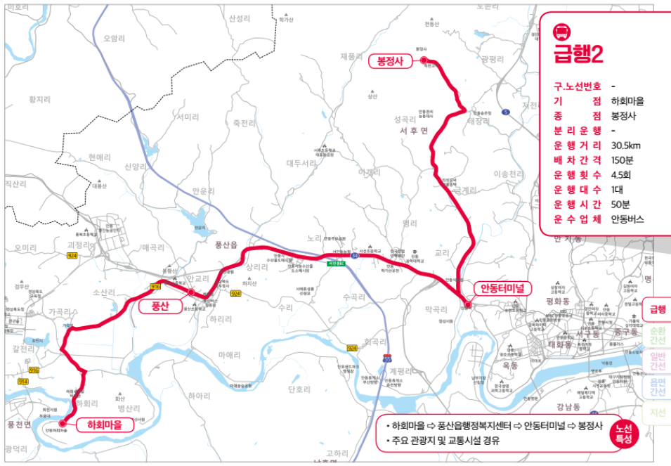 급행2번은 하회마을-풍산읍-안동터미널-봉정사를 운행하는 노선입니다.