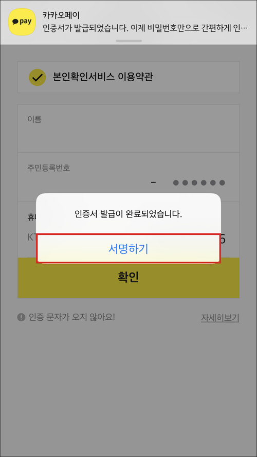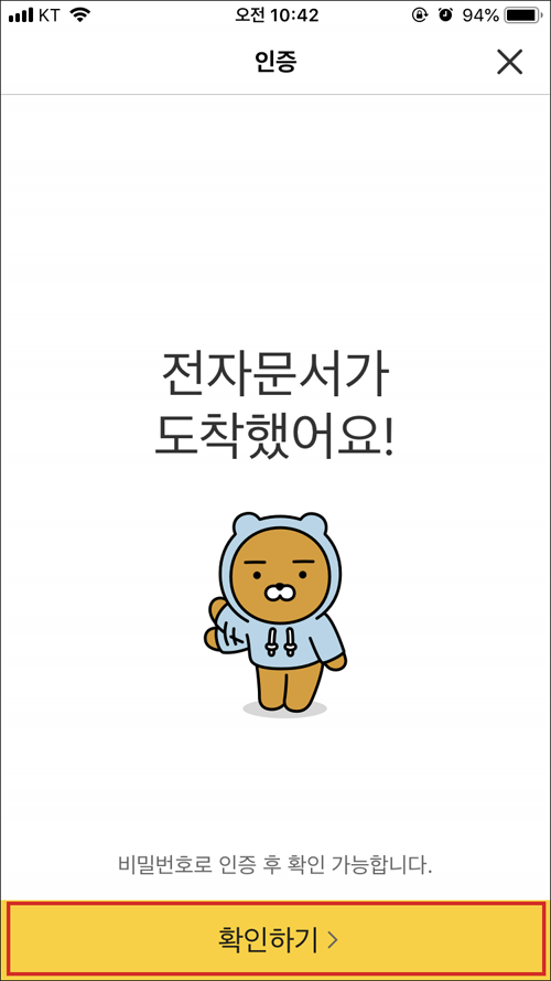 전자문서를 열람할 수 있는 카톡 인증서가 발급되었다.