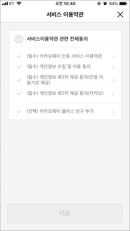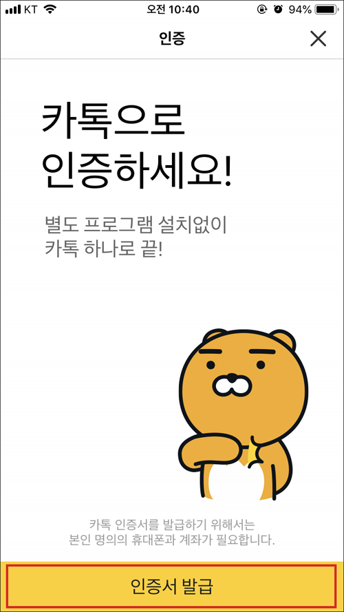 사전 안내장 전자문서를 열기 위한 카톡 인증서를 먼저 발급 받는다.