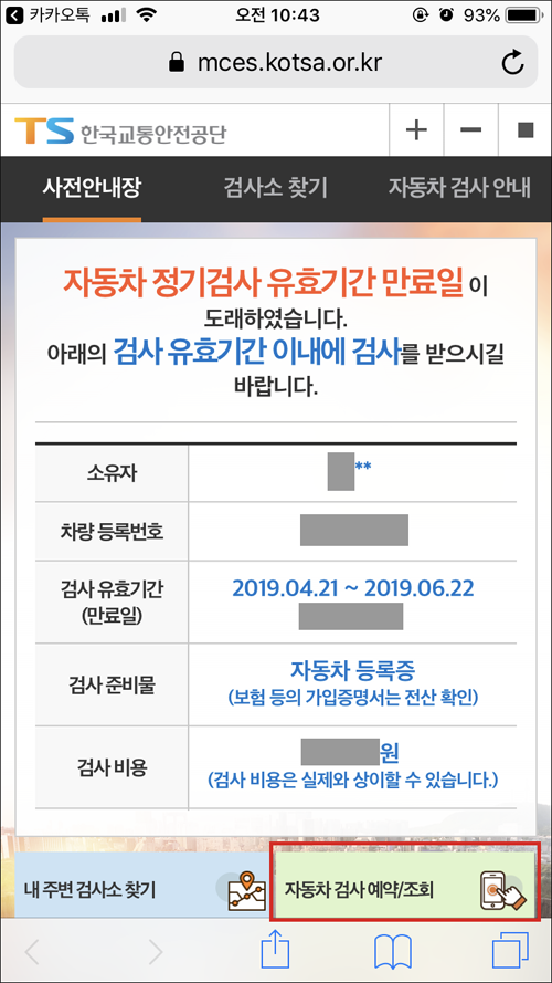 카톡으로 오는 자동차검사 사전 안내장