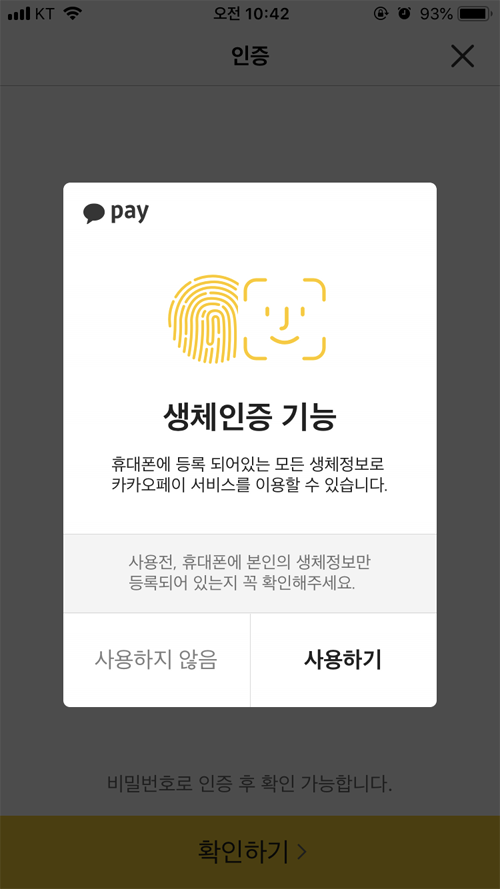 비밀번호가 번거롭다면 대신 내 휴대폰에 저장된 생체정보를 이용해 인증도 가능하다.