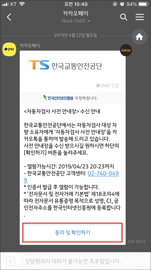 카톡 인증서로 열린 자동차 정기검사 안내장 전자문서