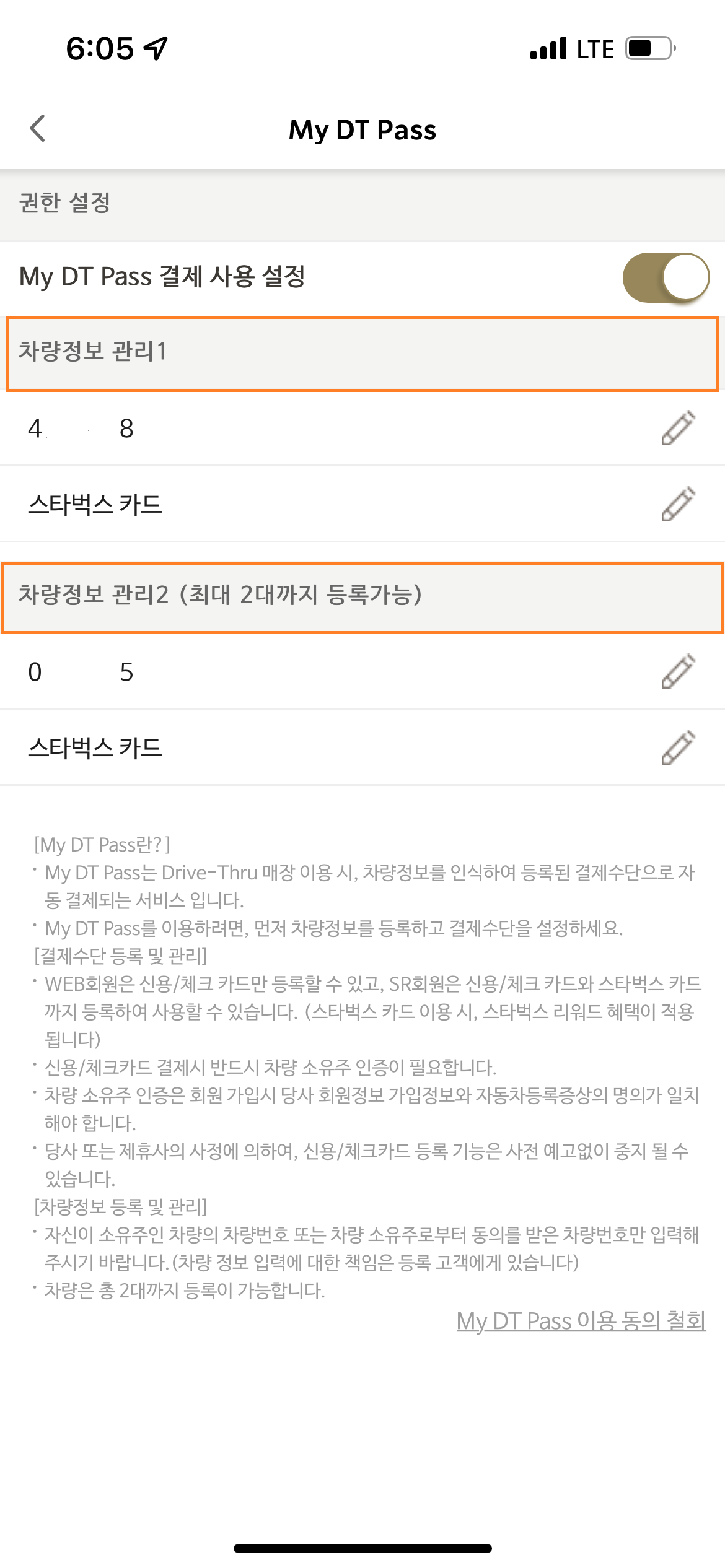 차량인식 자동 결제 시스템이 도입되어 스타벅스 카드로 차량번호를 연동시켜 차량이 진입시 번호판을 인식하여 주문이 된다.