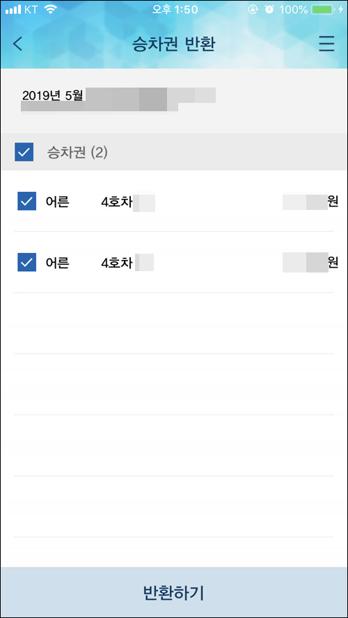 반환하고자 하는 승차권 2장 모두 선택 한 후 [반환하기]를 누른다.