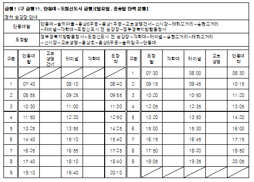경북도청 신도시와 안동대학교 노선인 급행11번 → 급행1번으로 변경