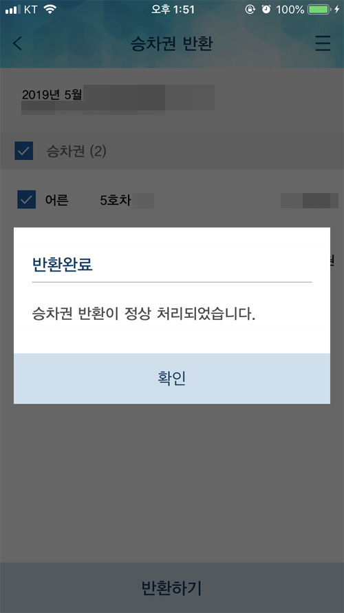 반환하고자 하는 승차권 2장 모두 선택 한 후 [반환하기]를 누른다.