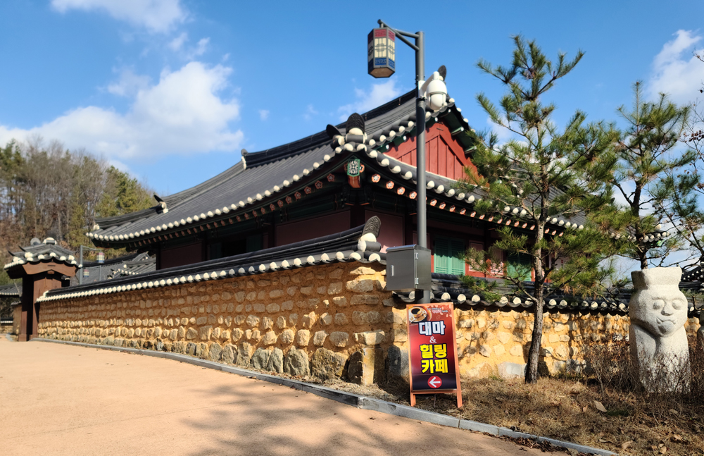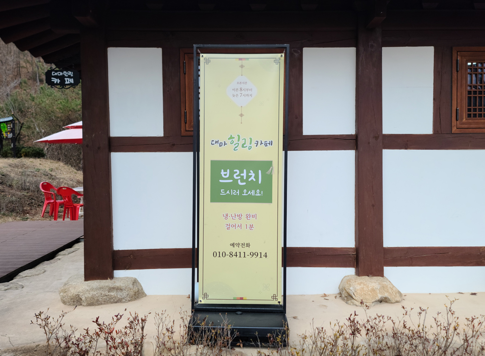 선성현문화단지 입구로 들어가서 조금만 걸어가면 정면에 대마힐링카페 광고판이 보여요.