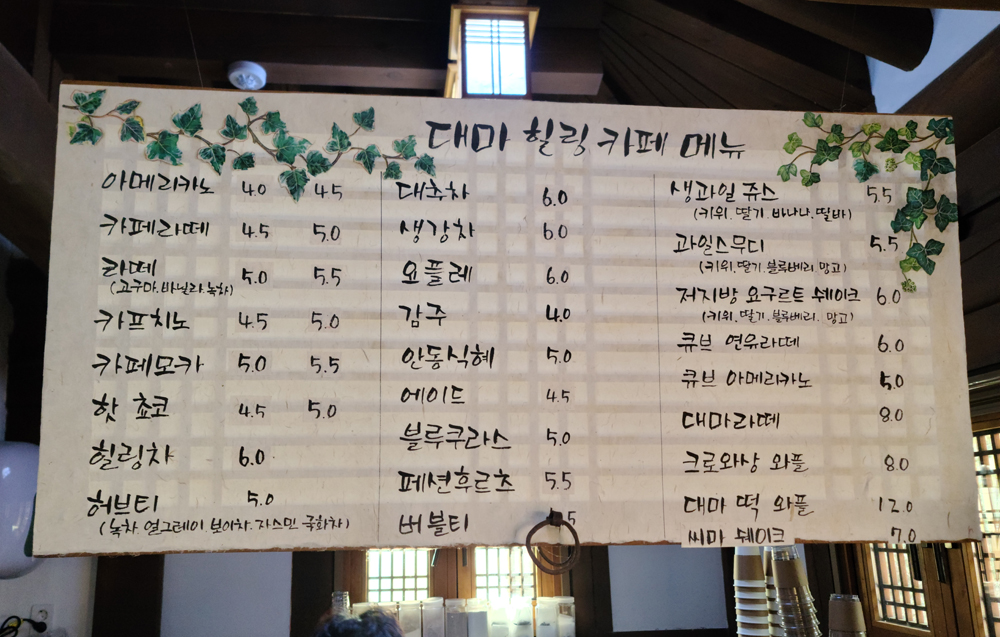 기본 카페 메뉴가 있고, 대마라떼 , 씨마쉐이크 등 특별 메뉴가 있어요.