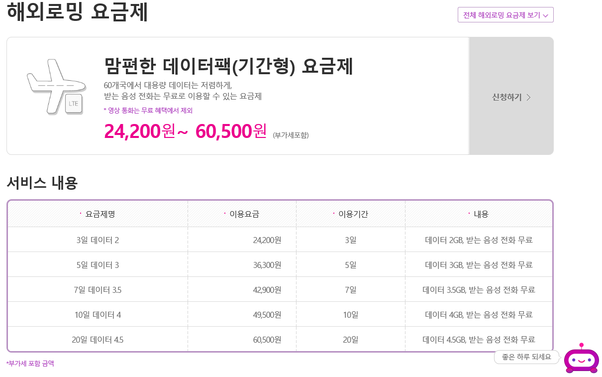 LGU+에서는 나라별 데이터가 동일하네요 .