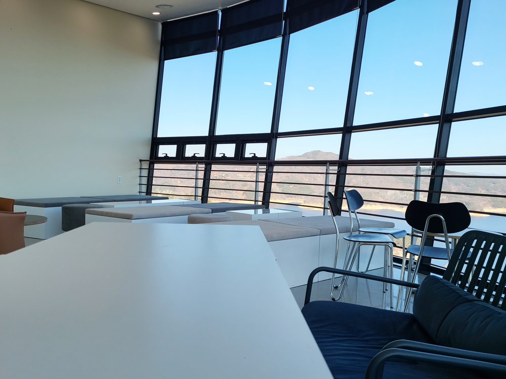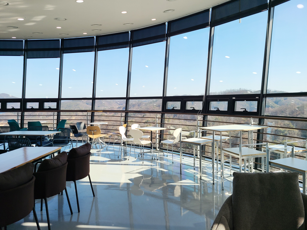 둥근 형태의 전망대로 지어진 건물이라 카페에서 안동댐을 360도 파노라마뷰로 감상 할 수 있어요.