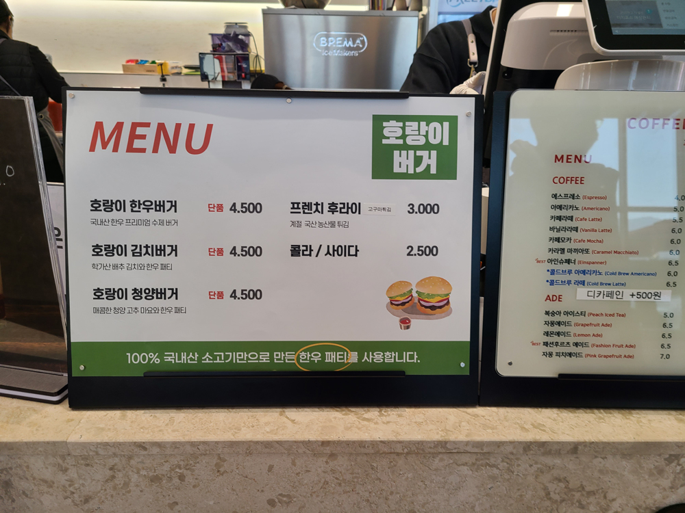 호랑이버거 메뉴로는 1) 기본 한우버거