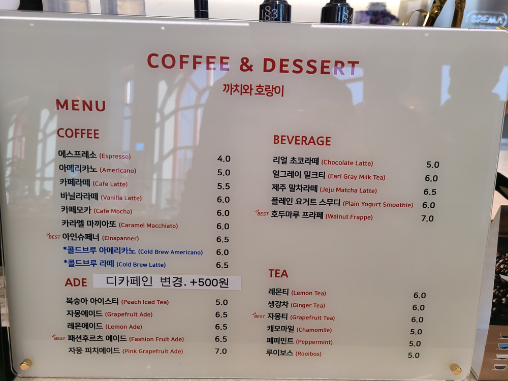 커피류는 아메리카노 5,000원으로 가격은 좀 있는 편이고, 디카페인도 주문이 가능해요.