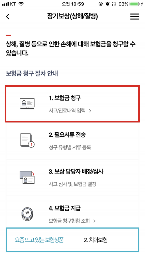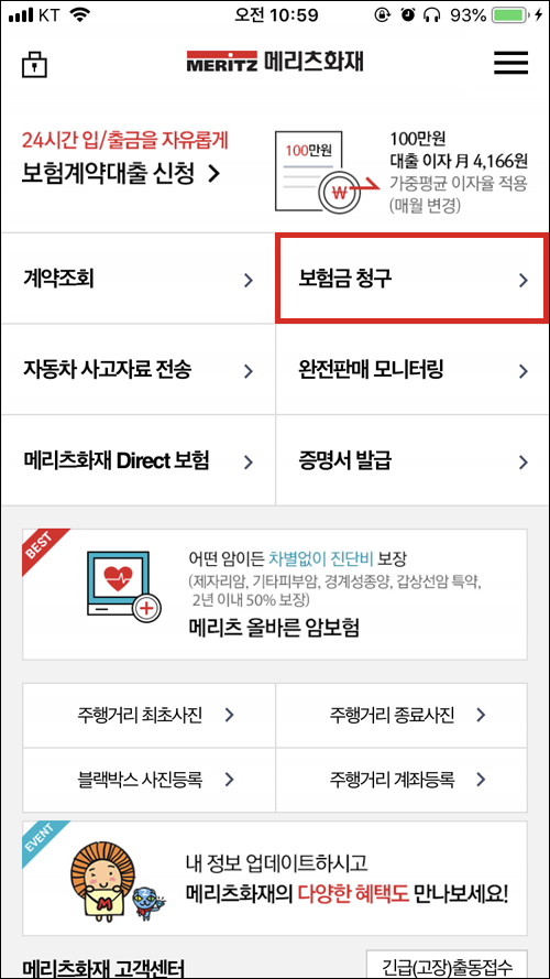 메뉴 > 보험금청구 메뉴로 들어간다.