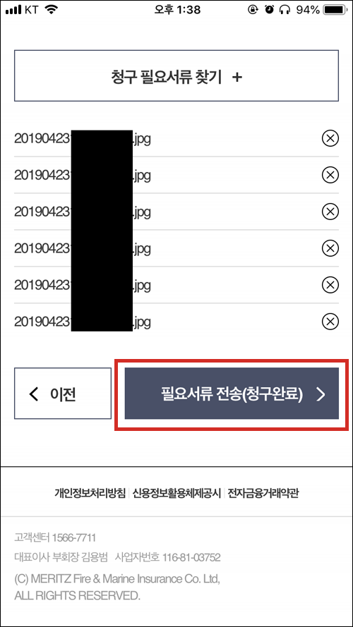 사진 첨부가 끝났으면 [필요서류 전송(청구완료)]를 선택하면 청구가 끝난다.