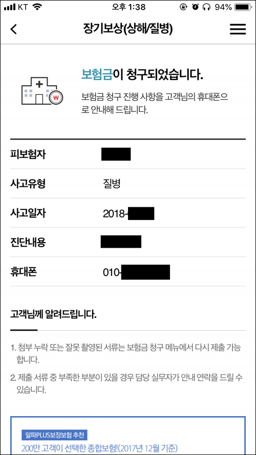 앱에서 메뉴 > 보험금청구현황 에 가면 현재 상황을 알 수 있다.