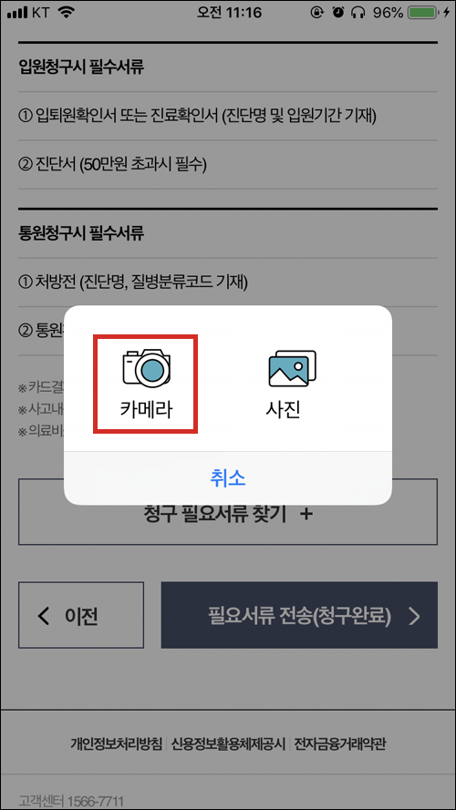 스마트폰으로 촬영한 처방전, 약제비영수증 같은 서류를 첨부할 수 있다.