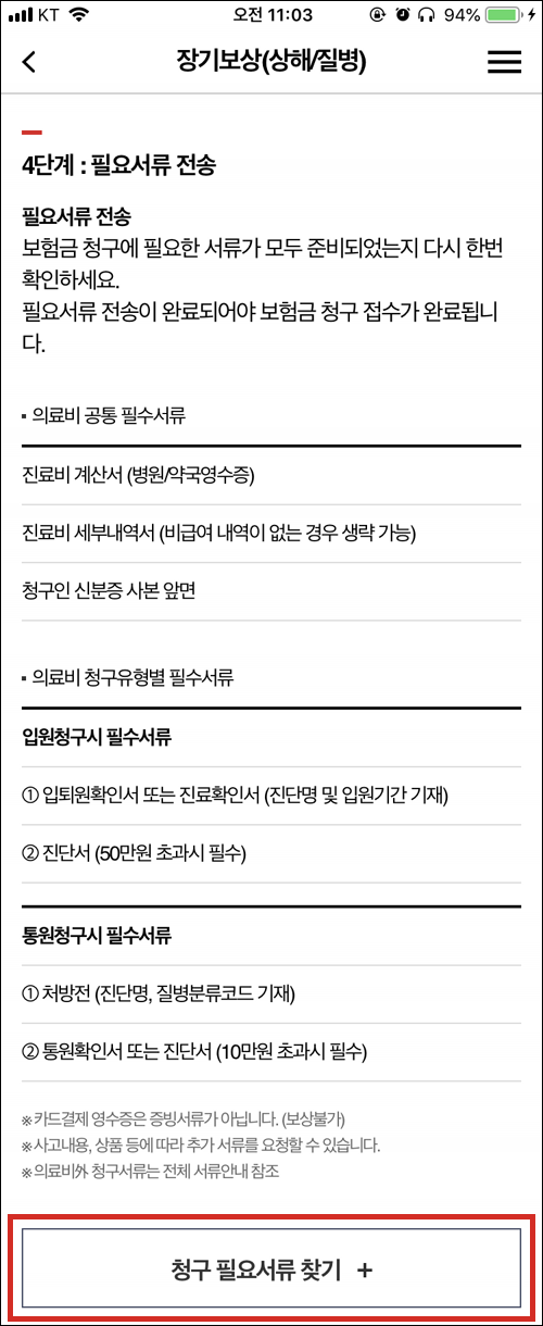 필요서류를 확인한 후 [청구 필요서류 찾기+]를 선택하면