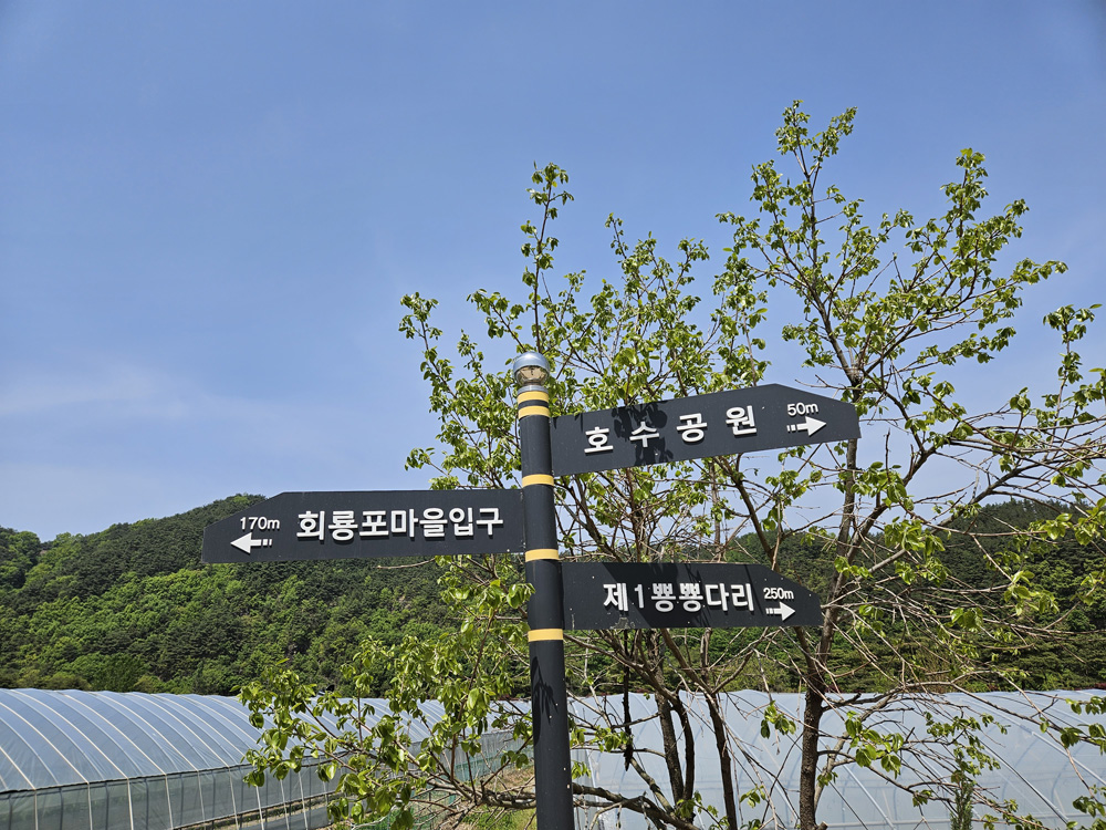 오랜 세월 퇴적물이 쌓여 육지 속의 섬마을이 된 회룡포은 입구의 뿅뿅다리를 건너면 닿을 수 있는데요.