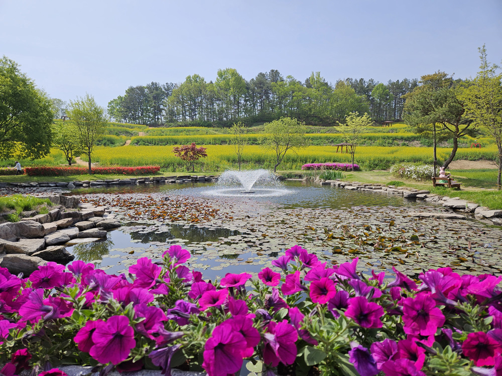 마을 가운데에 호수공원이 있고 양 옆으로는 청보리밭, 뒷편으로는 유채꽃밭이 있어요.