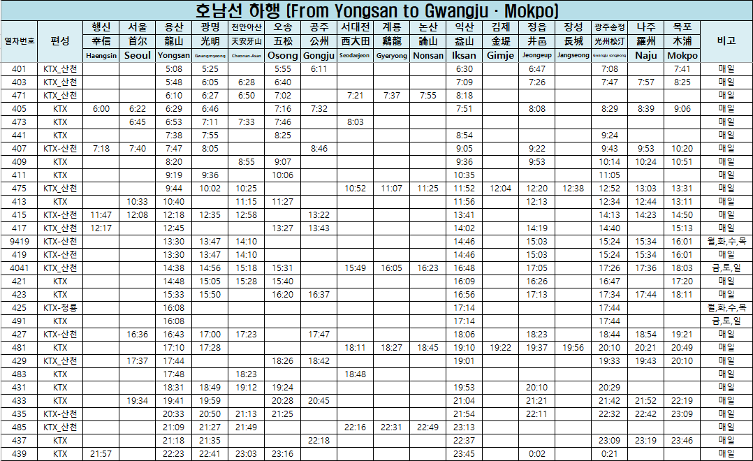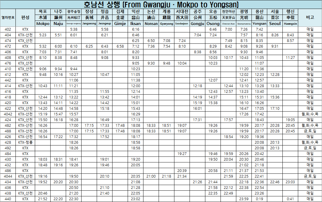 경부선 서울 부산역 ktx 기차 시간표(2024. 5. 1부터) (0) | 2024.04.18 |