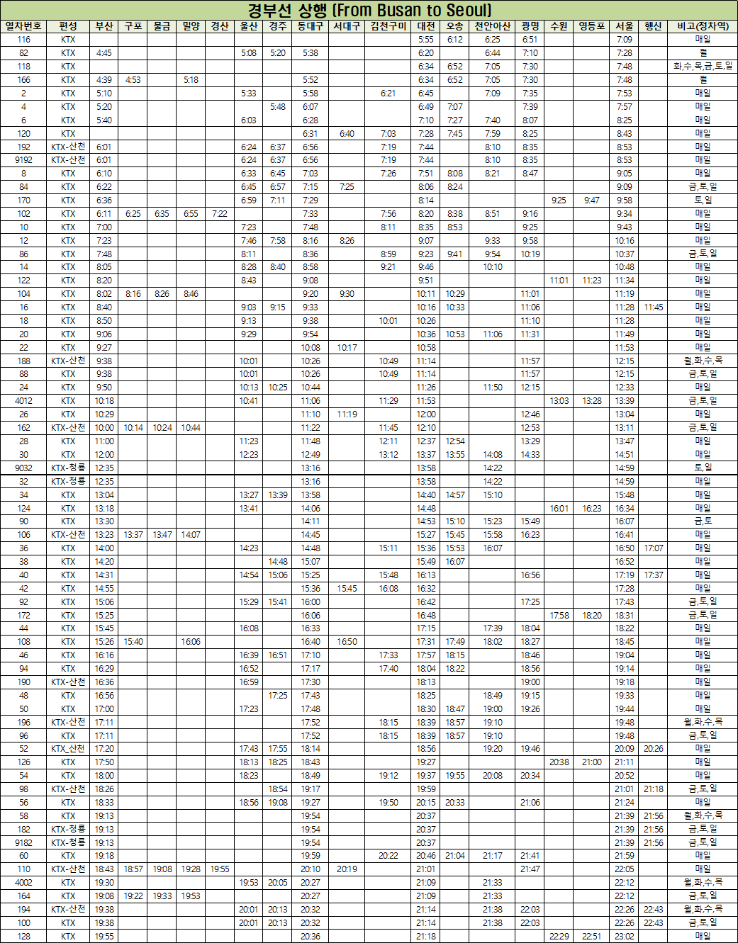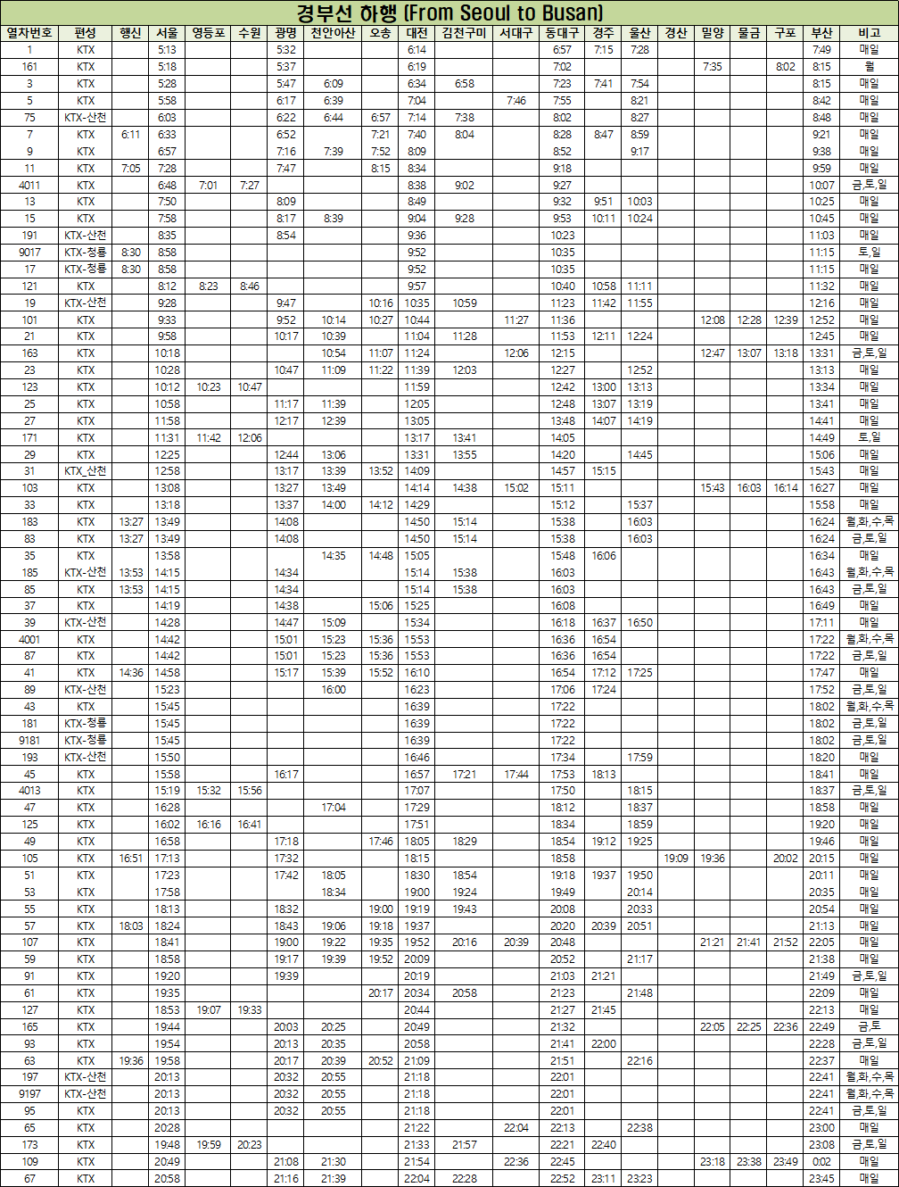 | 대전역, 동대구역, 경전선 KTX 기차 시간표(2024. 5. 1부터) (0) | 2024.04.19 |
