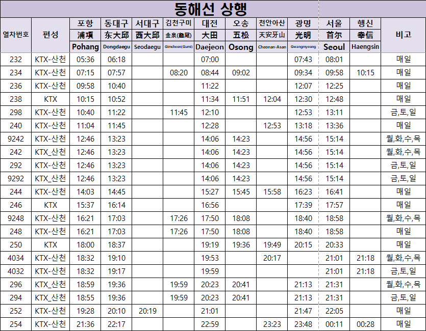 | 대전역, 동대구역, 경전선 KTX 기차 시간표(2024. 5. 1부터) (0) | 2024.04.19 |