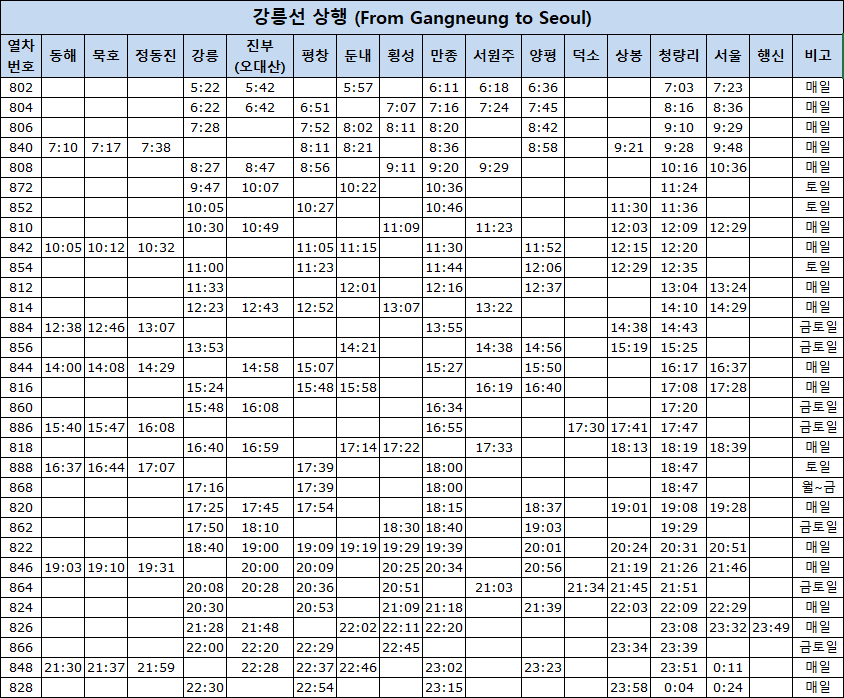 전 노선 KTX 이음 열차로 운행되며 매일 또는 요일별로 운행되는 시간대가 다르니 열차 시간표를 꼭 확인하시기 바랍니다.
