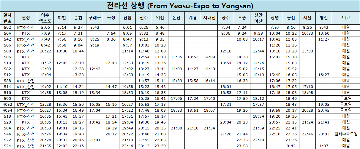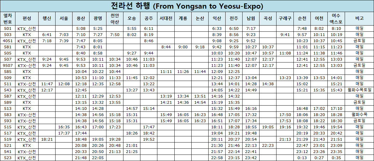 | 동해선 서울 → 포항 ktx 기차 시간표(2024. 8. 19부터) (0) | 2024.08.03 |