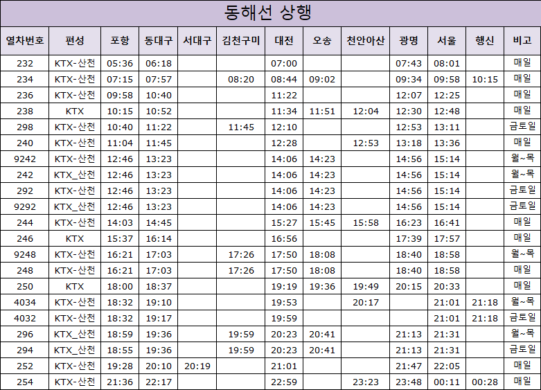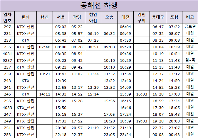 | 경부선 서울 부산역 ktx 기차 시간표(2024. 8. 19부터) (0) | 2024.08.04 |