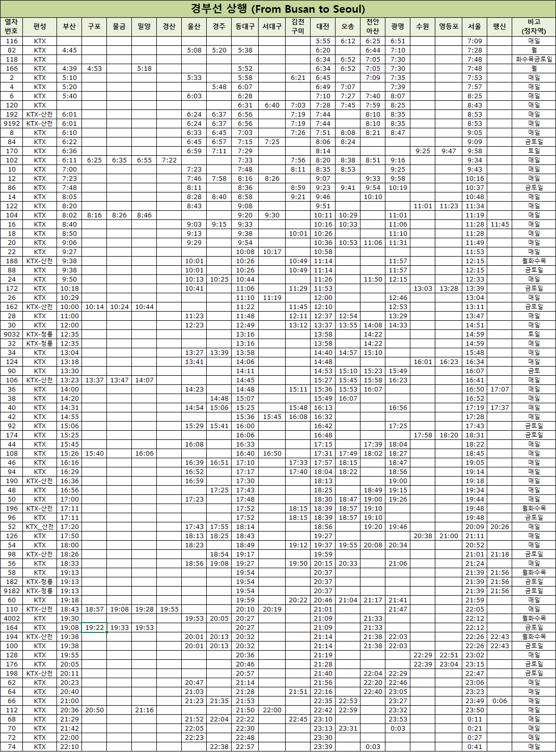 | 동해선 서울 → 포항 ktx 기차 시간표(2024. 8. 19부터) (0) | 2024.08.03 |