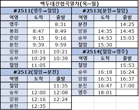 백두대간의 굽이치는 계곡과 때묻지 않은 자연을 만끽할 수 있는 백두대간협곡열차의 운행 시간표입니다.