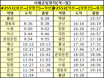 | 전라선 서울역 여수엑스포역 남도해양관광열차 기차시간표 (2024. 8. 19 부터) (0) | 2024.08.12 |