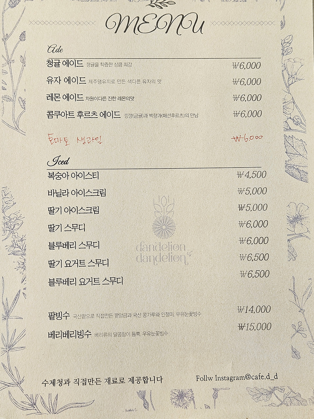 딸기 스무디, 복숭아 아이스티 등 다양한 음료를 맛볼 수 있어요. 에그타르트, 귀리 쿠키, 수제 그래놀라 등 다양한 디저트도 있으니, 함께 곁들여 먹기 좋습니다. 카페에서는 직접 만든 음료와 디저트를 판매하고 있어요. 단호박과 귀리로 만든 민들레라떼가 시그니처 메뉴라서, 강진에 오면 꼭 한 번 맛보시길 추천드립니다.
