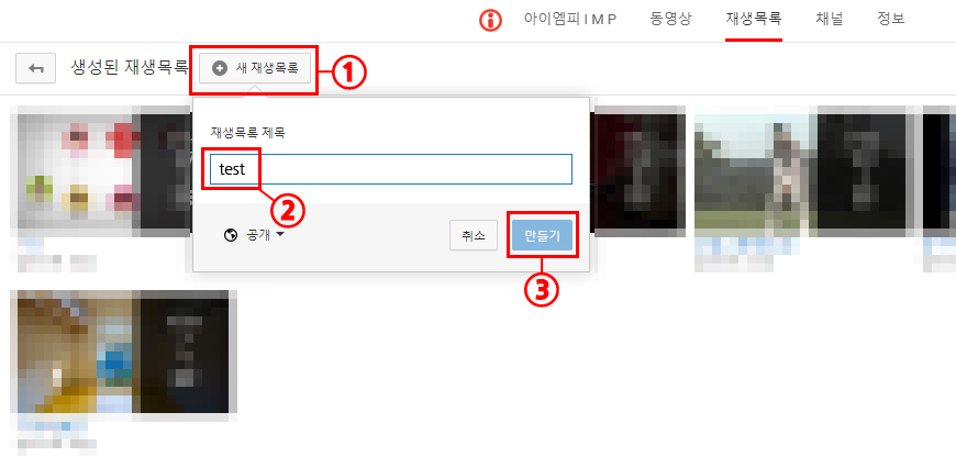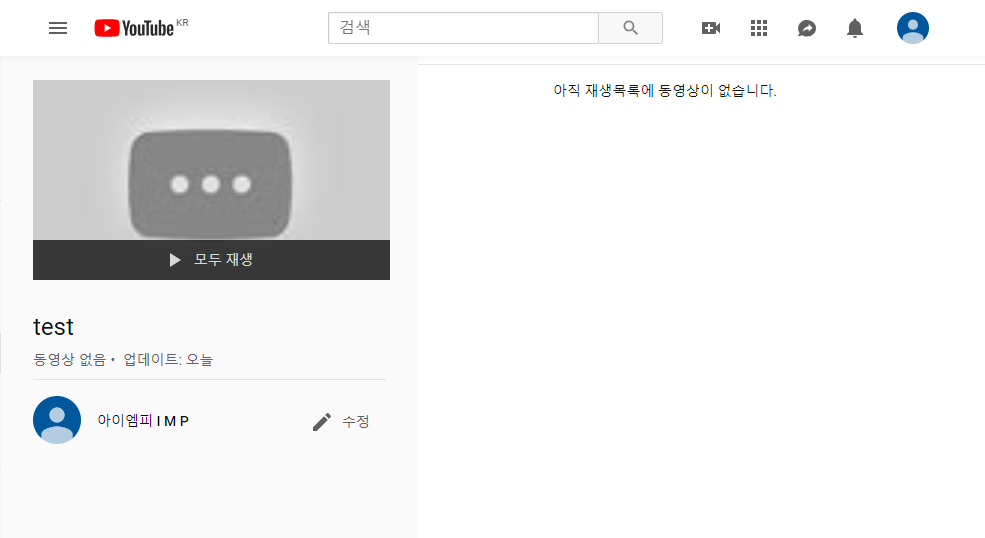 7. test 제목으로 된 빈 재생목록 생성을 완료하였습니다.