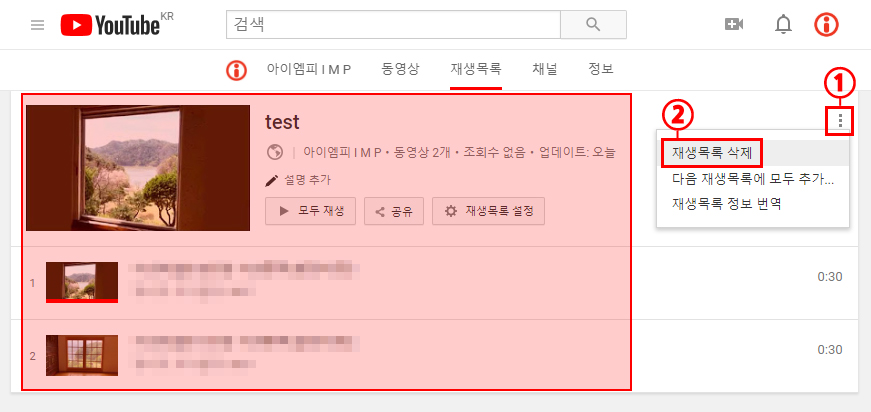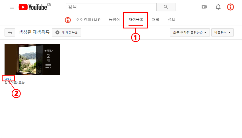 6. test 재생목록에 선택한 동영상이 추가됩니다.