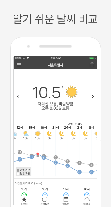 1시간, 3시간, 10일 예보와 대기 정보는 물론 자외선 정보와 일출일몰 시간까지 한 페이지에서 모두 볼 수 있다는 것도 큰 장점