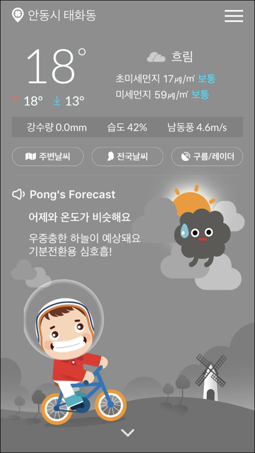 웨더퐁 날씨는 감성적인 날씨 멘트와 퐁캐릭터 및 하늘상태 애니메이션으로 차별화된 날씨정보를 제공합니다. ★ 귀여운 퐁캐릭터와 함께 감성날씨 일기예보 - 하루 날씨예보를 세분화한 감성문구로 전달하여 차별화된 날씨감성 제공 ★ 대기환경정보, 생활날씨 날씨정보 제공 - 초미세먼지, 미세먼지, 통합대기지수에 따른 행동 지침 제공 - 일상 생활과 밀접한 세차, 빨리, 자외선 지수 정보 제공으로 날씨에 따른 생활 대응 ★ 기상청 관측망을 통해 1분 단위로 실시간 날