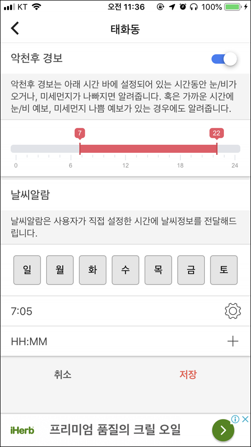 날씨 알람 설정도 가능.
