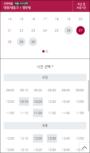 엔지니어의 방문을 원하는 날짜와 시간을 선택할 수 있다.
