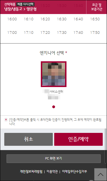 날짜, 시간, 엔지니어를 선택(엔지니어가 2명 이상이면 신청자가 선택 가능)하고 [인증/예약]을 누르면 끝!