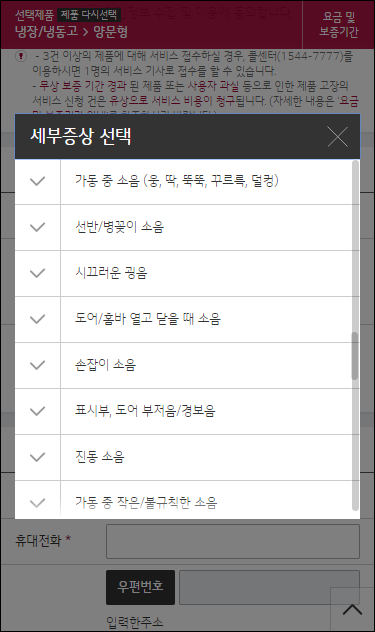 ※ 메인 화면 아래쪽에서 [엔지니어 출장 예약]을 선택하면, 2단계에 해당 제품을 선택하게 된다.