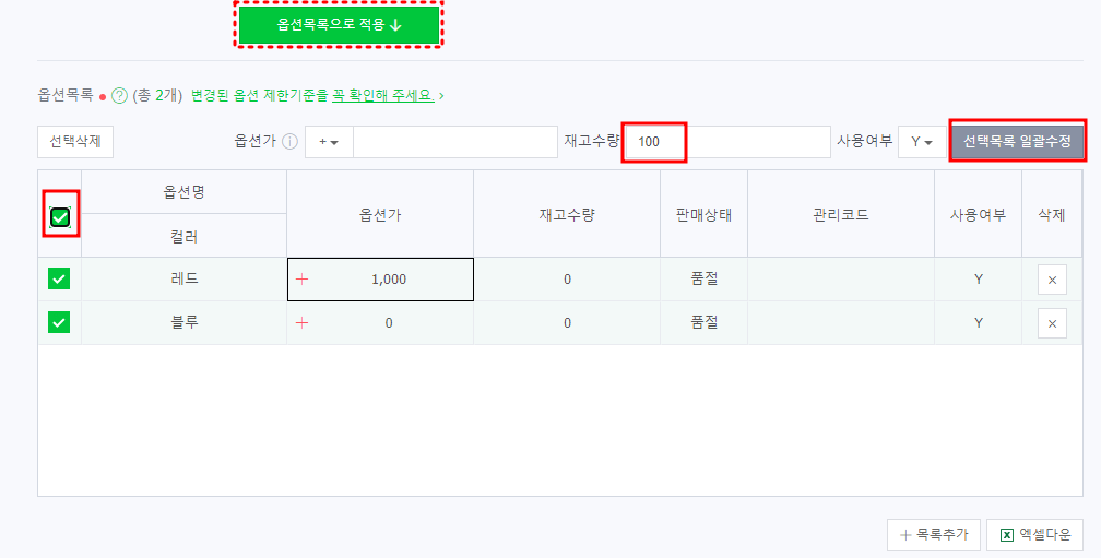 상품선택 - 재고수량 등록 - 선택목록 일괄수정